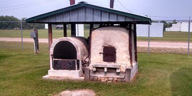 This replica, constructed in 1980 of brick, clay, cement and straw, is an example of one type of outdoor baking source that would have been used before the modern stove. The roof over top helps provide protection from the elements.