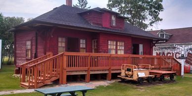 Rebuilt in 1909 after fire destroyed the original station in 1907, the station was located on Pacific Avenue between Second and Third Street and was used until 1972. It was then dismantled in 1974 by John Funk who donated the front wall to the museum. The rest of the building was constructed from logs from the Loeb homestead in Lydiatt.