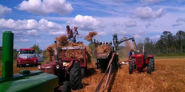We grow our own wheat on site and use a tractor powered threshing machine to harvest it during our annual heritage day in August.